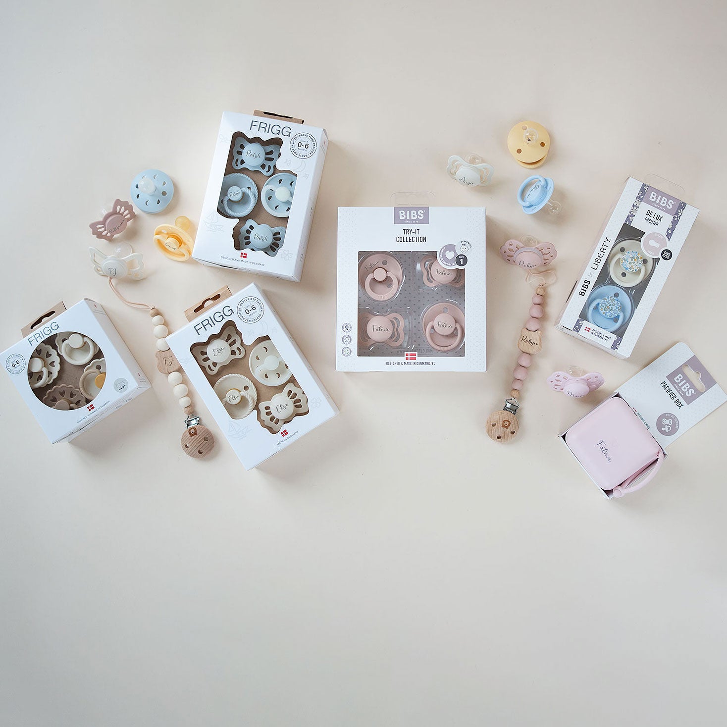 Pacifiers from top global brands like BIBS, FRIGGS and MAM, personalised with your baby's name. Add a matching accessory to secure your pacifier.