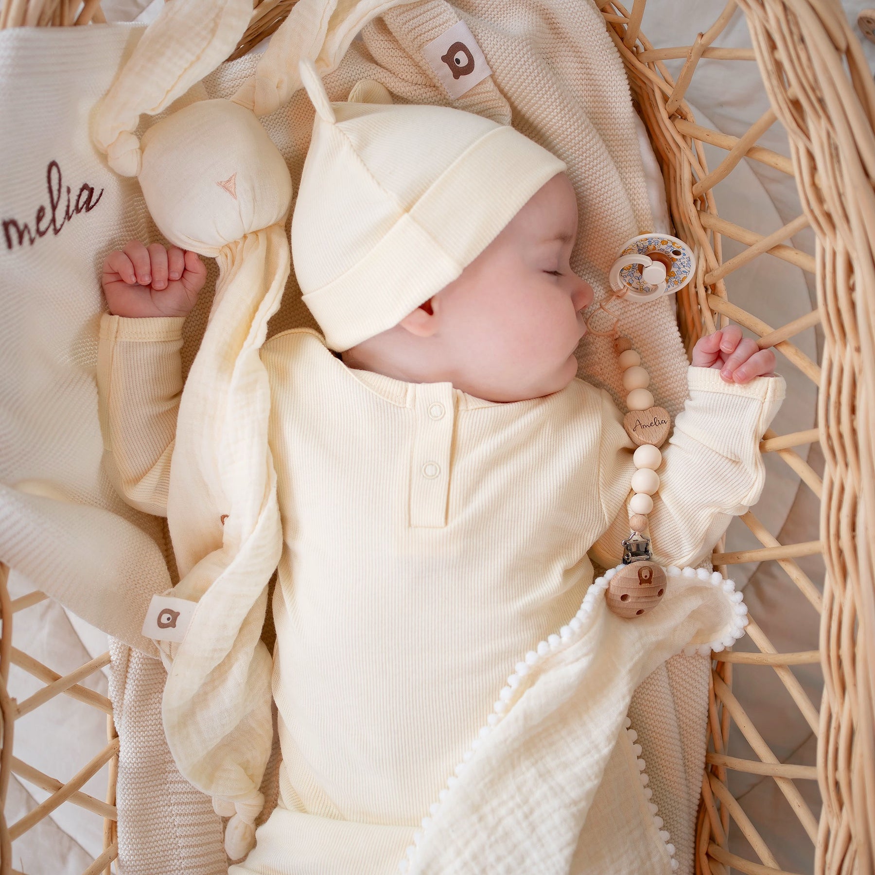 Ce doudou adorable en forme de lapin est plus qu'un simple compagnon câlin : c'est aussi un porte-sucette pratique ! Conçu avec une boucle intégrée, il permet à votre bébé de garder sa sucette à proximité sans attacher quoi que ce soit à ses vêtements. Fabriqué en mousseline de coton biologique certifiée GOTS à 100 %, il est doux pour les peaux sensibles.
