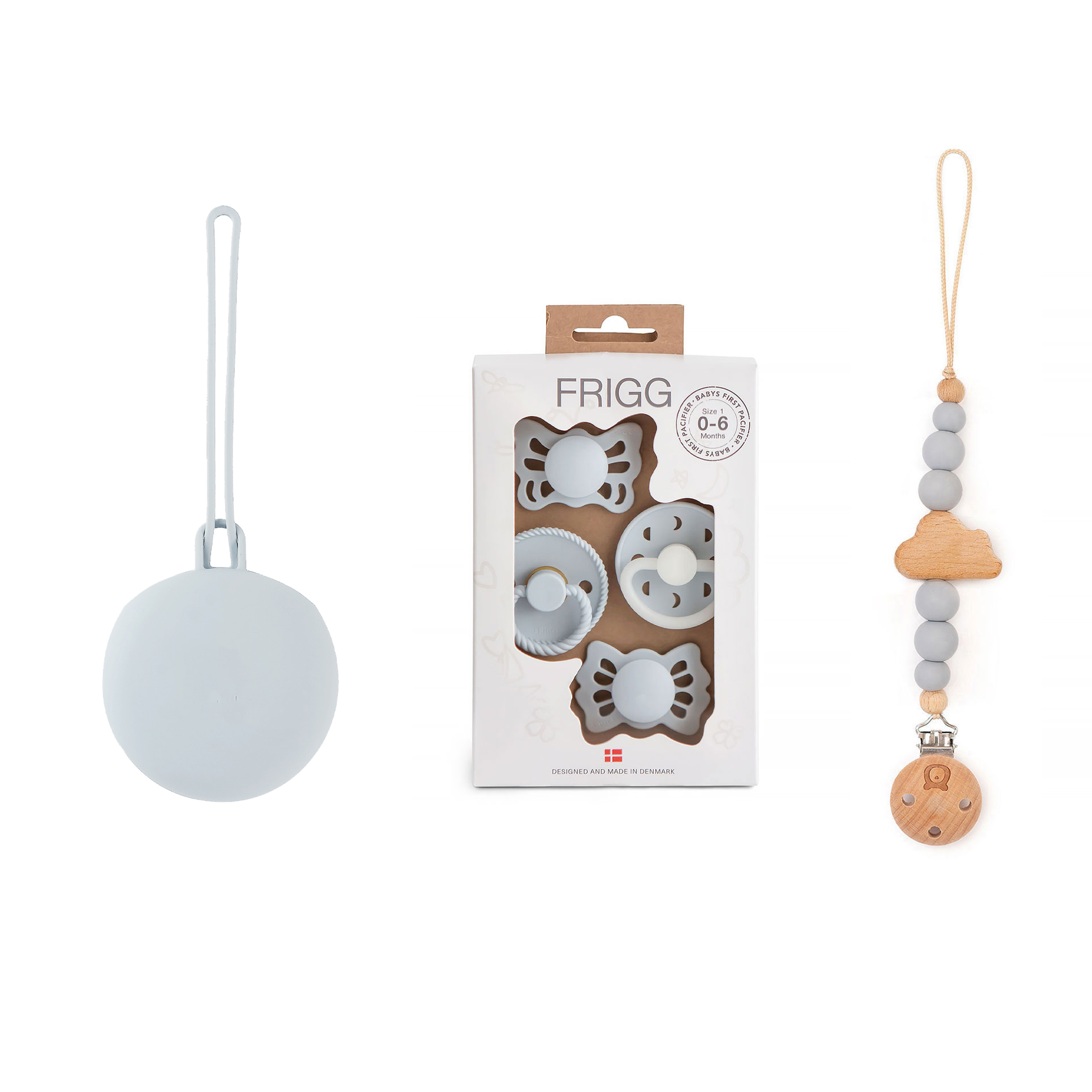 Ensemble de premières Sucettes pour bébé Frigg avec porte-sucettes assortis.